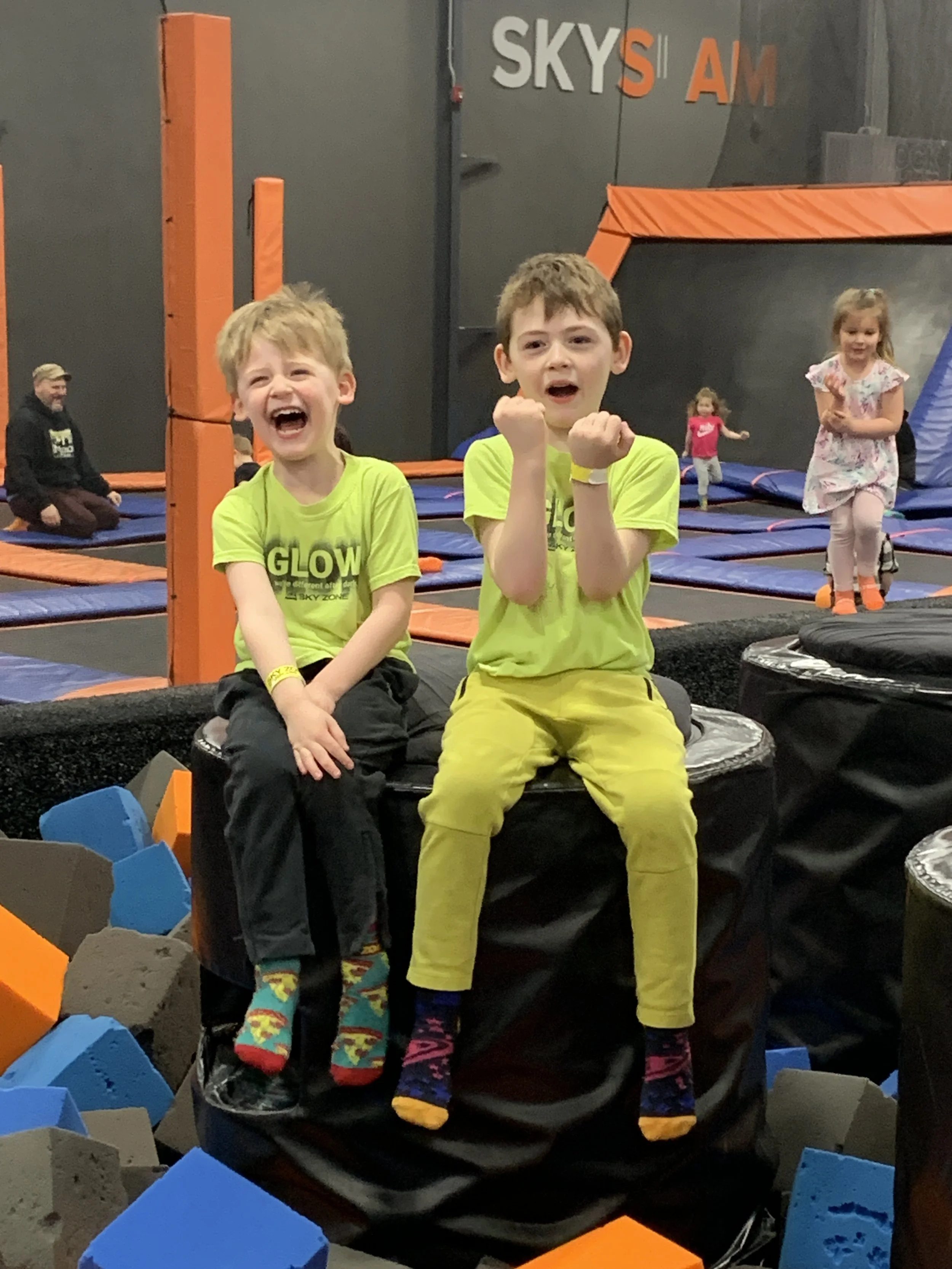 My kids at SkyZone. Yes, it pains me to post a low-quality cell phone image with highlighter yellow shirts and mismatched pants, but Dad dressed them this day and they look so happy!